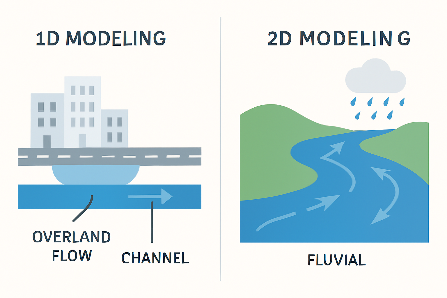 1D modeling simplifies flow into channels or pipes — excellent for quick assessments or long linear systems like rivers and drainage channels.